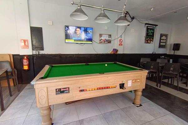 El interior (60m²) está climatizado y listo para funcionar. Actualmente cuenta con una zona de juegos (billar) y pantallas para deportes, pero ofrece una versatilidad enorme: