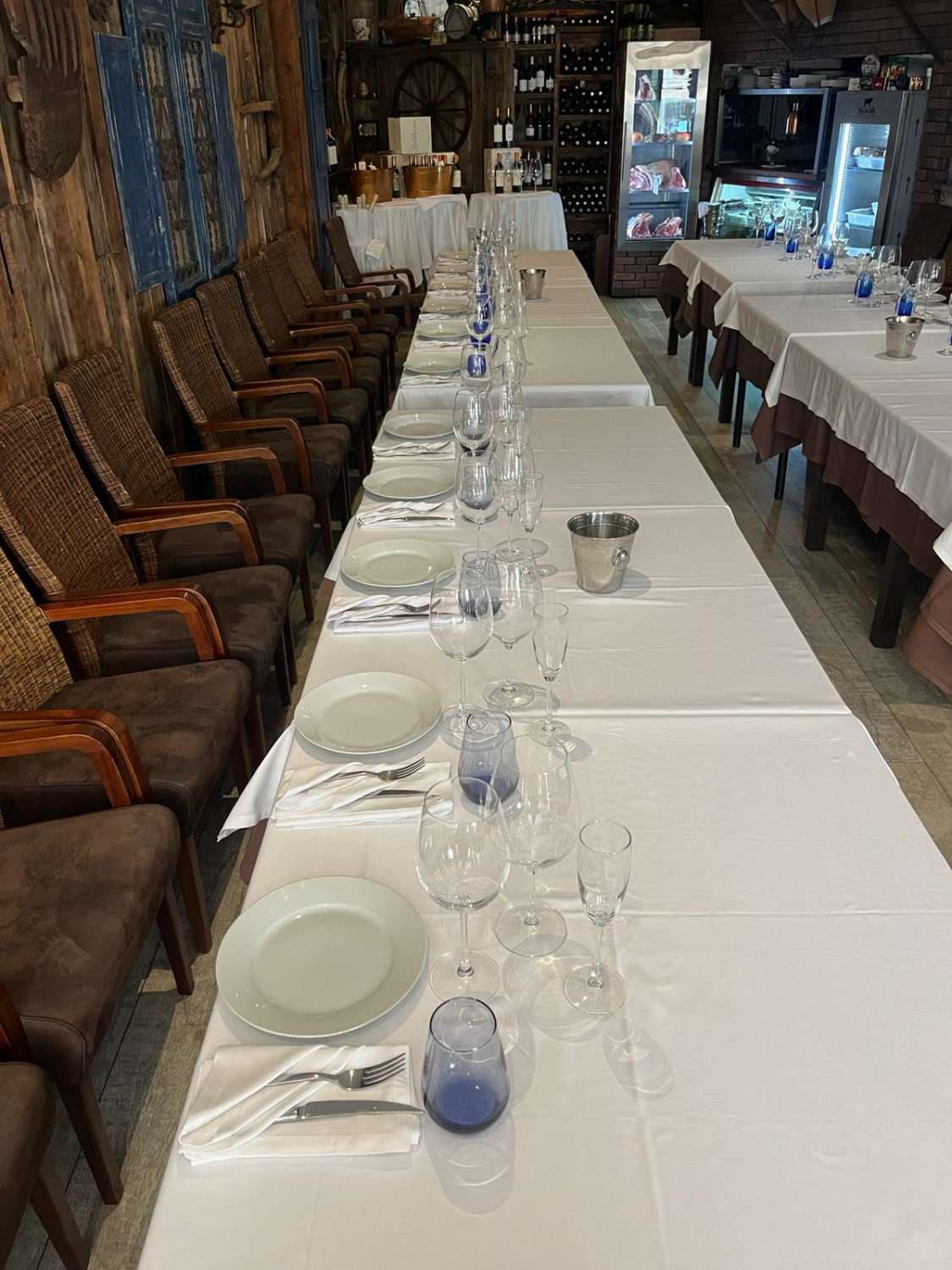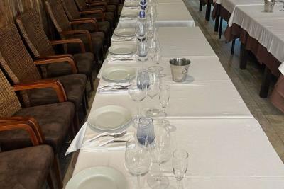 Dentro hay 10 mesas con 40 asientos, mobiliario, mantelería y vajilla todo esta impecable