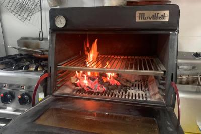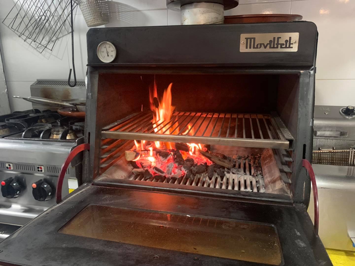 La zona de cocina , tiene un área de elaboración, zona de campana de extracción de humos con BARBACOA A CARBON, otra campana de extracción de humos con FUEGOS , FREIDORA ETC, y zona de lavado.