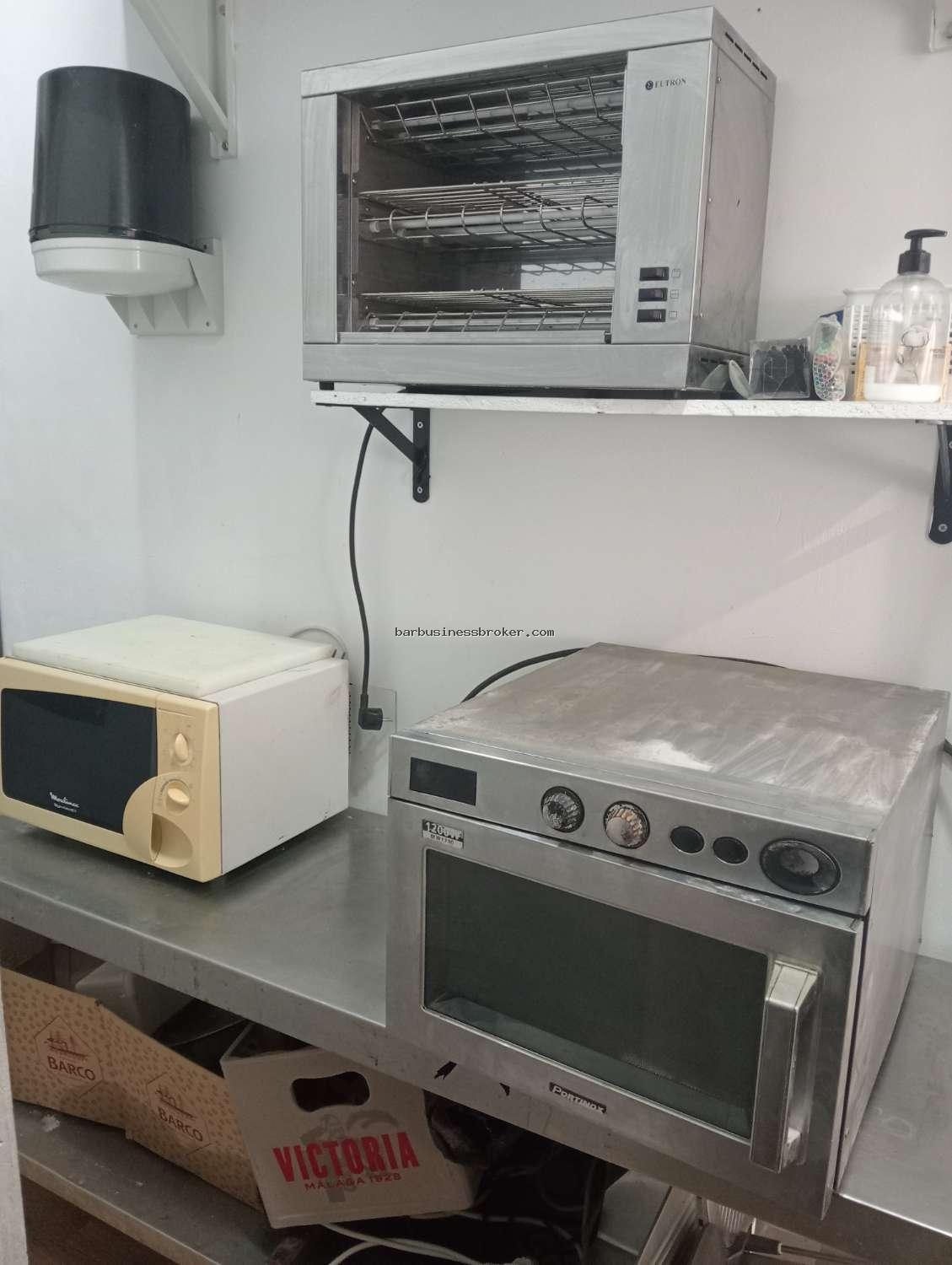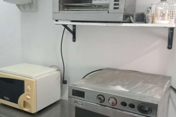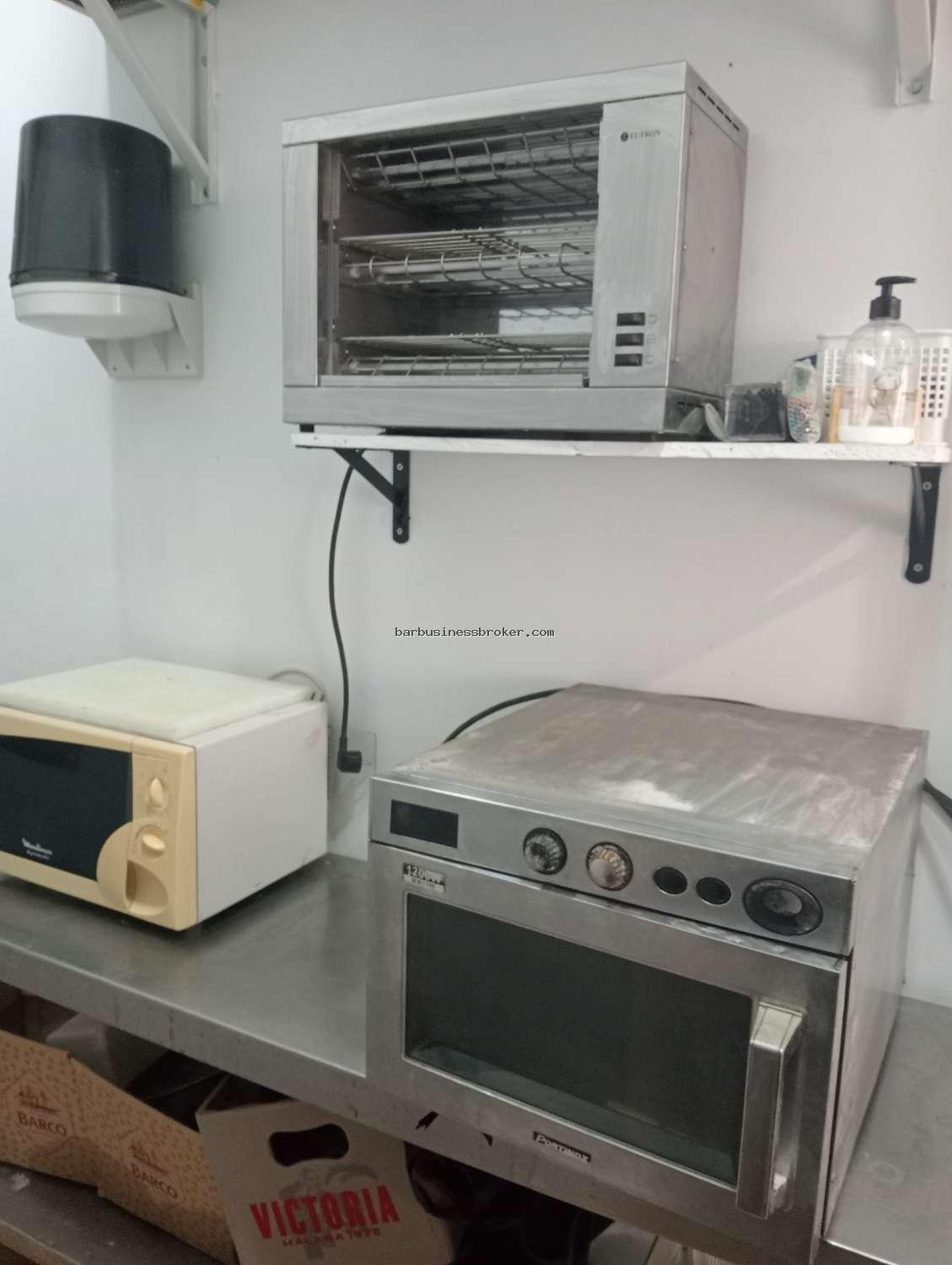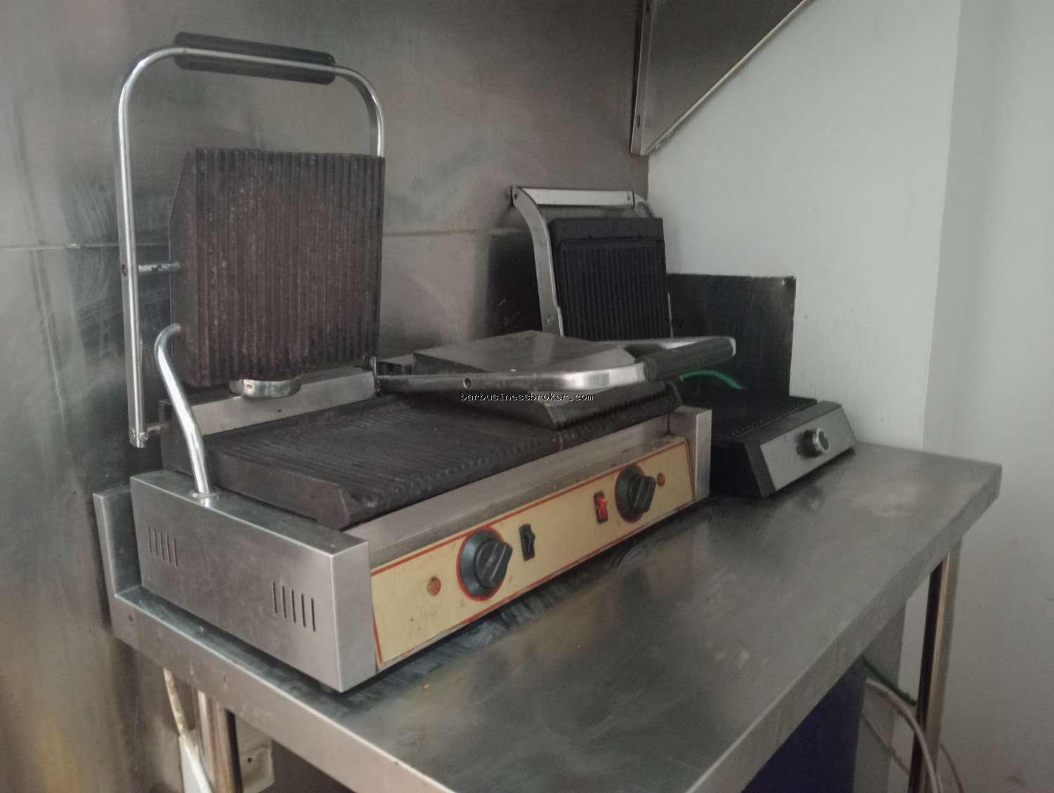 Équipement Gastro Ready (Sans Sortie de Fumée) : Vous n'avez pas besoin d'installations coûteuses. La cuisine est parfaitement équipée pour le concept Gastro : grill électrique de contact, salamandre, table de travail en acier inoxydable, pétrin, réfrigérateurs (avec saladette), congélateur et four électrique, micro-ondes. Idéal pour plats pré-cuisinés, froids et chaleur régénérée.
